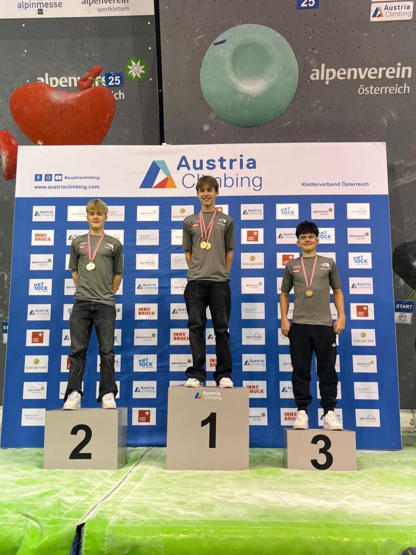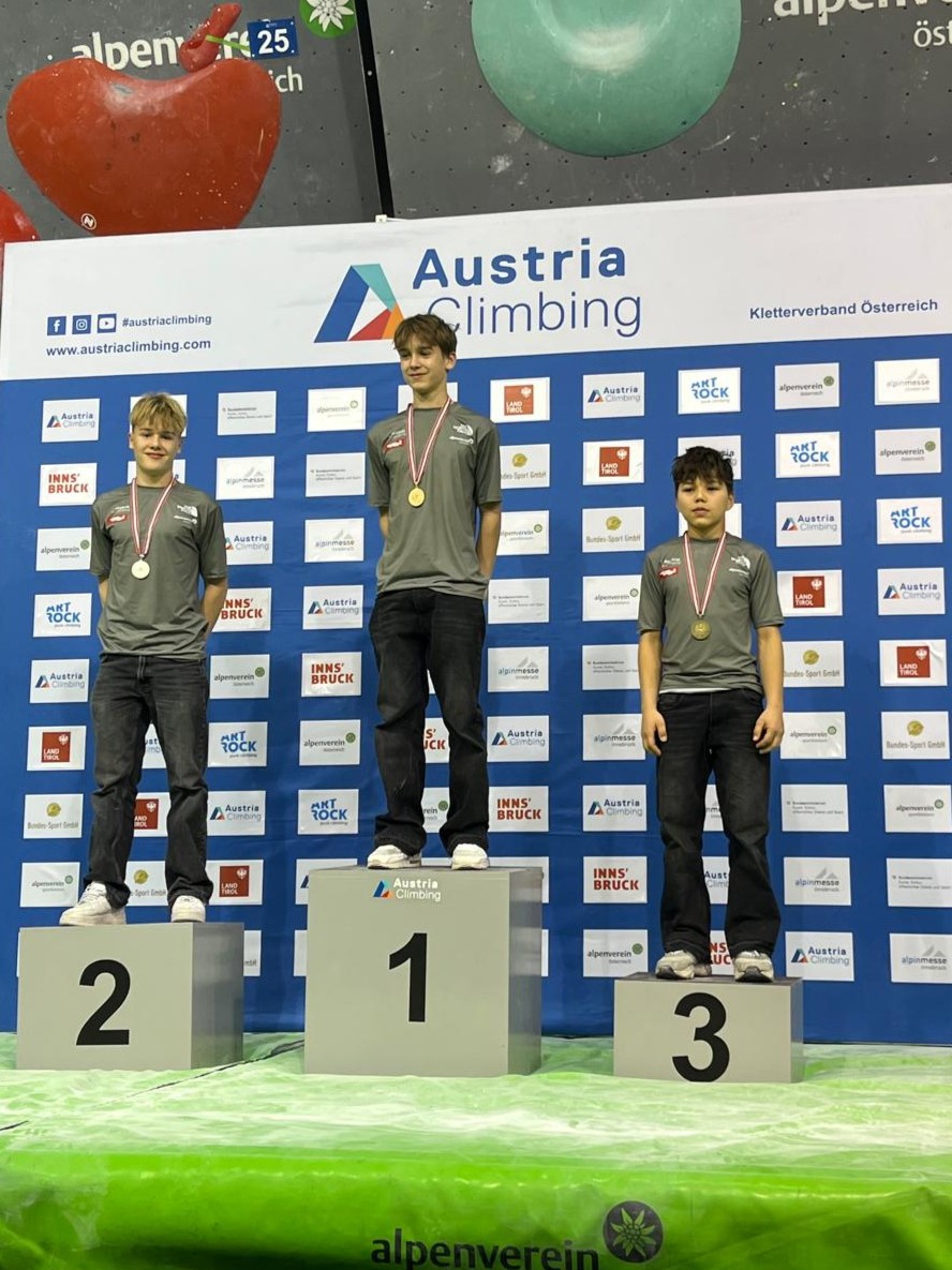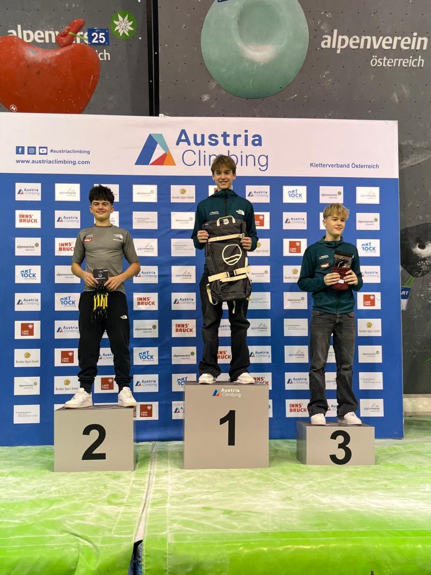 In der U15 männlich Kategorie holte sich Julian Pliger mit 84,2 Pkt. im Finale den dritten Platz. Mit einer gesamt Punkte Anzahl von 285 Pkt. in der Austria-Cup-Gesamtwertung ist Julian nun neuer Österreichischer Vizemeister im Bouldern.
